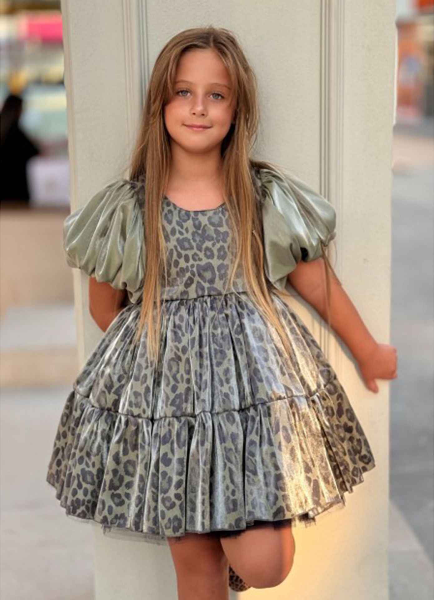 • YEŞİL LEOPAR DESENLİ BALON KOL ELBİSE